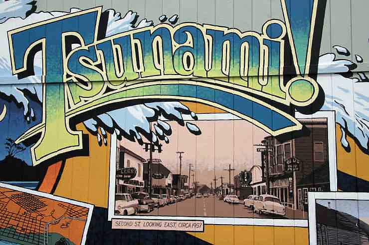 This closeup view of one section of the mural shows the title lettering as well as a view of downtown Crescent City the way it looked before the tsunami struck. The photo this is painted from was taken just a few yards from where the viewer is standing when looking at the mural.