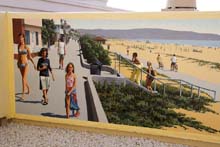 This mural is in a private residence in Manhattan Beach, CA. From their living room and adjacent patio on the third floor, the owners have a wonderful view of the Santa Monica Bay and the Pacific Ocean but they cannot see the beach, which is obscured by the houses closer to the beach. So they commissioned Art to create a panorama of the beach in Manhattan Beach, highlighting some of the activities and landmarks on the beach such as volleyball, surfing, bicycling, sunbathing, strolling on The Strand (the walk along the edge of the beach), the pier, etc. The mural is on the wall around a deck just outside the living room of the residence.