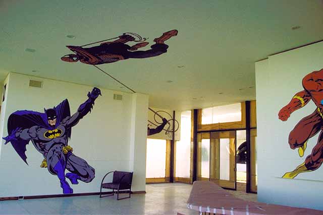 The largest room in the Guber house has four murals in it. They are: Batman, Spiderman (on the ceiling, of course), Catwoman (mostly out of sight behind corner in center), and The Flash (partly visible on the rtight). The counter of a wet bar can be seen in the lower right. The ceilings are 11 feet high. |